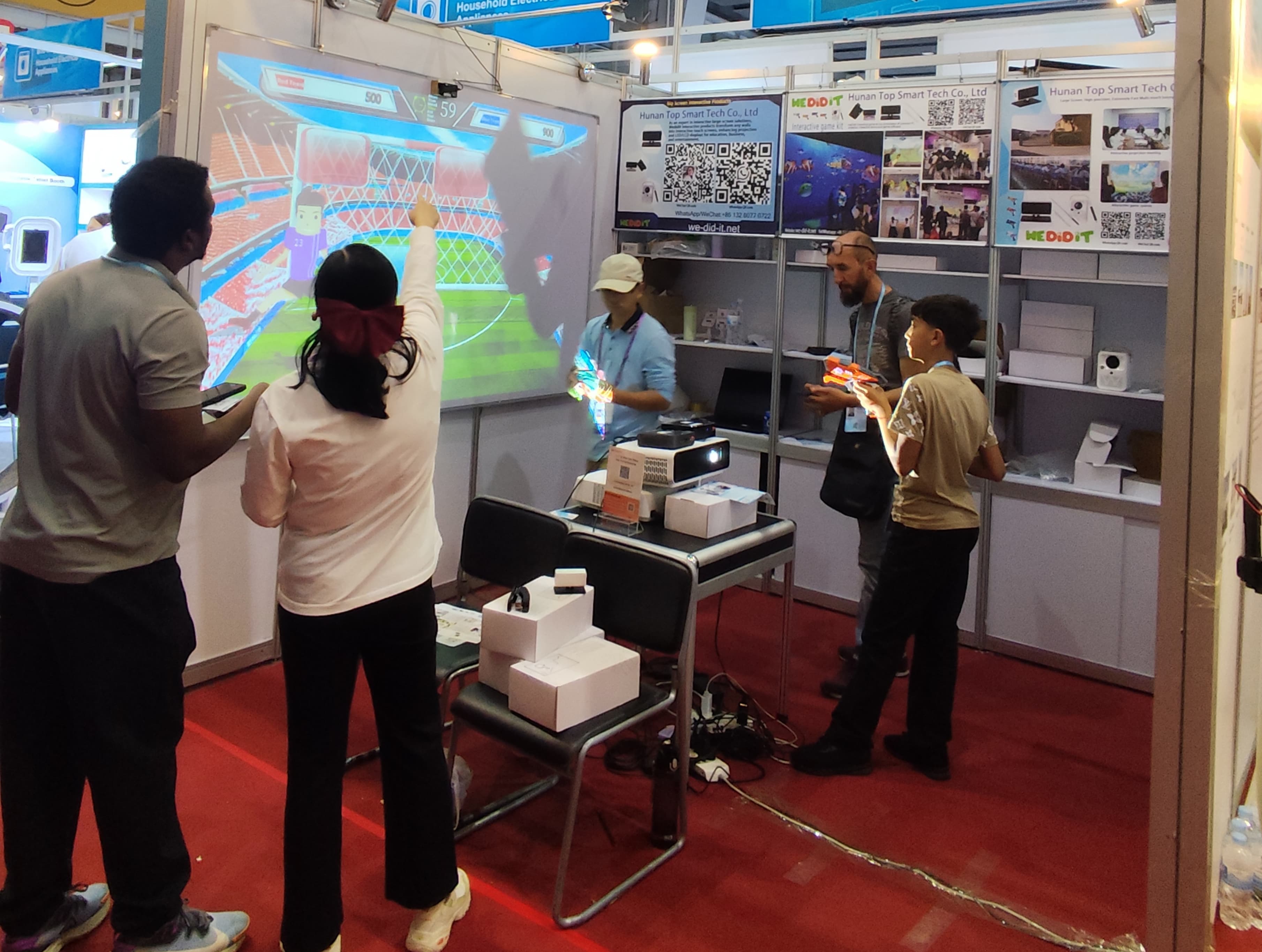 The interactive game system has become a "check-in place" for young merchants. This system innovatively integrates laser touch technology and an immersive game engine to achieve virtual and real interaction through precise motion capture. Game content can be customized according to scenes such as supermarkets and children's parks. It can also expand the screen to an infinite large screen to play games without being constrained by the size of the scene, making it more immersive. The interactive games demonstrated on-site using our self-developed game system and infrared laser gun attracted many visitors to experience it. Mr. Chen, a Singaporean businessman, said: "This kind of entertainment and interactive product has great potential in the Southeast Asian market. We plan to introduce the first 200 sets for shopping mall operations."